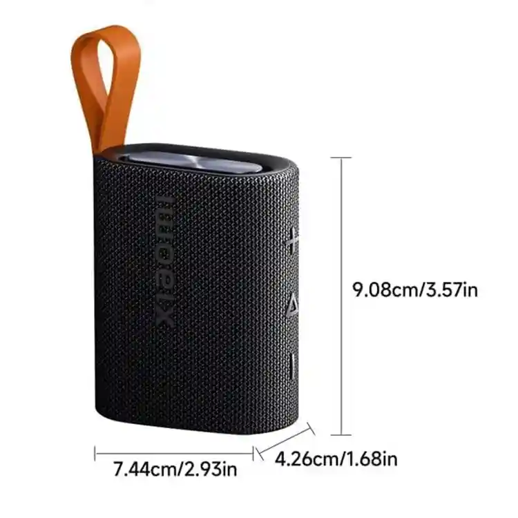 این اسپیکر تنها ۲۰۰ گرم وزن دارد؛ یعنی تقریباً هموزن یک گوشی موبایل یا یک بطری کوچک قهوه. طراحی آن به گونهای است که به راحتی در جیب شلوار یا کیف کمری جا میشود. بند لاستیکی مقاوم (Anti-loss lanyard) و ترکیب رنگ مشکی با نوار نارنجی، ظاهری مدرن، اسپرت و مینیمال به آن بخشیده است. شما میتوانید آن را هم به صورت افقی و هم عمودی قرار دهید.