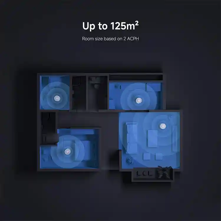 مساحت پوشش‌دهی تا ۱۲۵ متر مربع (بر اساس ۲ بار تصفیه در ساعت)