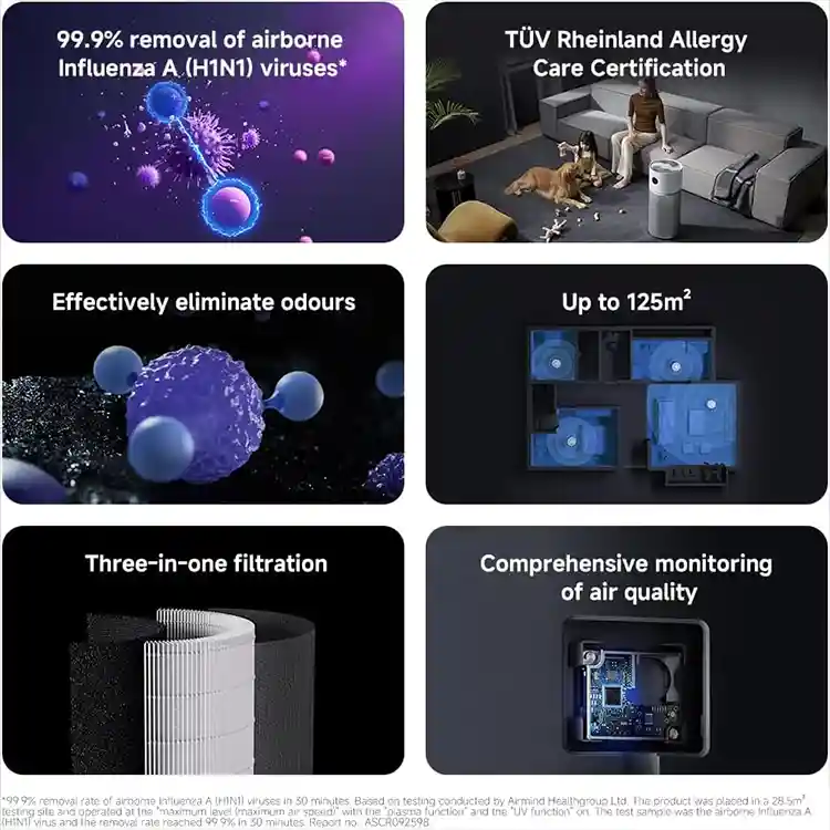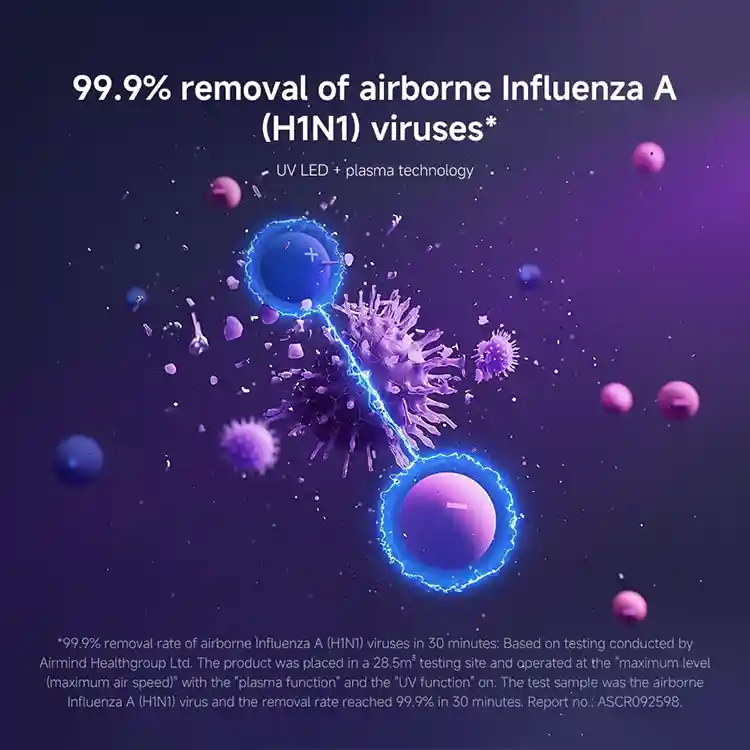 • Sterilization: UV-C LED + Plasma Technology (99.9% removal of H1N1)