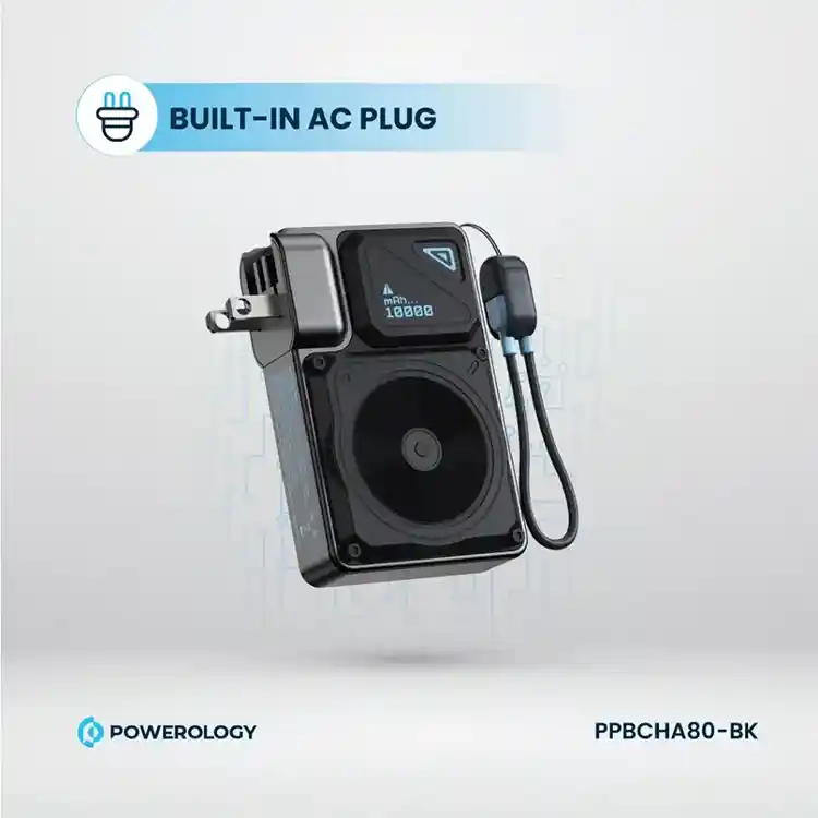 مهمترین ویژگی این محصول، داشتن دو شاخه برق تاشو (AC Plug) روی بدنه است.